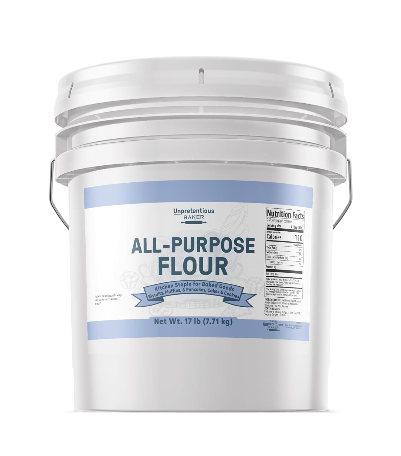 Unpretentious Harina multiusos Baker en un cubo resellable Textura ligera y suave, ideal para todo tipo de horneado Viene en un cubo sellado, bueno para el almacenamiento de alimentos Se puede utilizar para hacer galletas, panqueques, cortezas de pastel y panes Empaquetado en los Estados Unidos